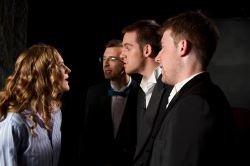 Christopher Jones (Wriggs) seems to be very talented. He has a great voice and a big, broad personality. However, his voice sometimes didn’t fit completely with the style of the music. He also has extremely expressive and telling nonverbal reactions. On the other hand, his performance was a little too big for the small space, and he seemed much older than it would have been nice to see the character portrayed, in look and actions. While he is very good, this might not be the right stage, show, and role for him to best let his skills shine. Nick Huber (Marlon) was good at creating a very real character. He seemed like he just said the things that he said and not like they had been written for him. The only issue was that there was not much of a change in his character between time periods, although it was discussed that the character had actually changed dramatically. Huber also had a nice, solid vocal. Mike Mililo (Wayne) came across a little inexperienced on stage, but he demonstrated great heart that made you feel like he was really trying. He was able to make his character likeable even when not fully believable. Although he did not have a great tone quality and sometimes struggled a little with finding his harmony notes, when he did hit the harmony line, he and Huber blended beautifully.